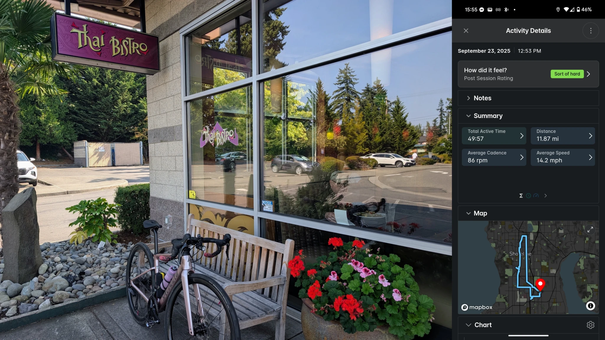 今日は短めのライド。レストランの前で撮ってますが、ここで食べたわけではありません。最近のシアトルでは外食は犯罪的に高いので、もう滅多なことがない限り家で食べてます。
