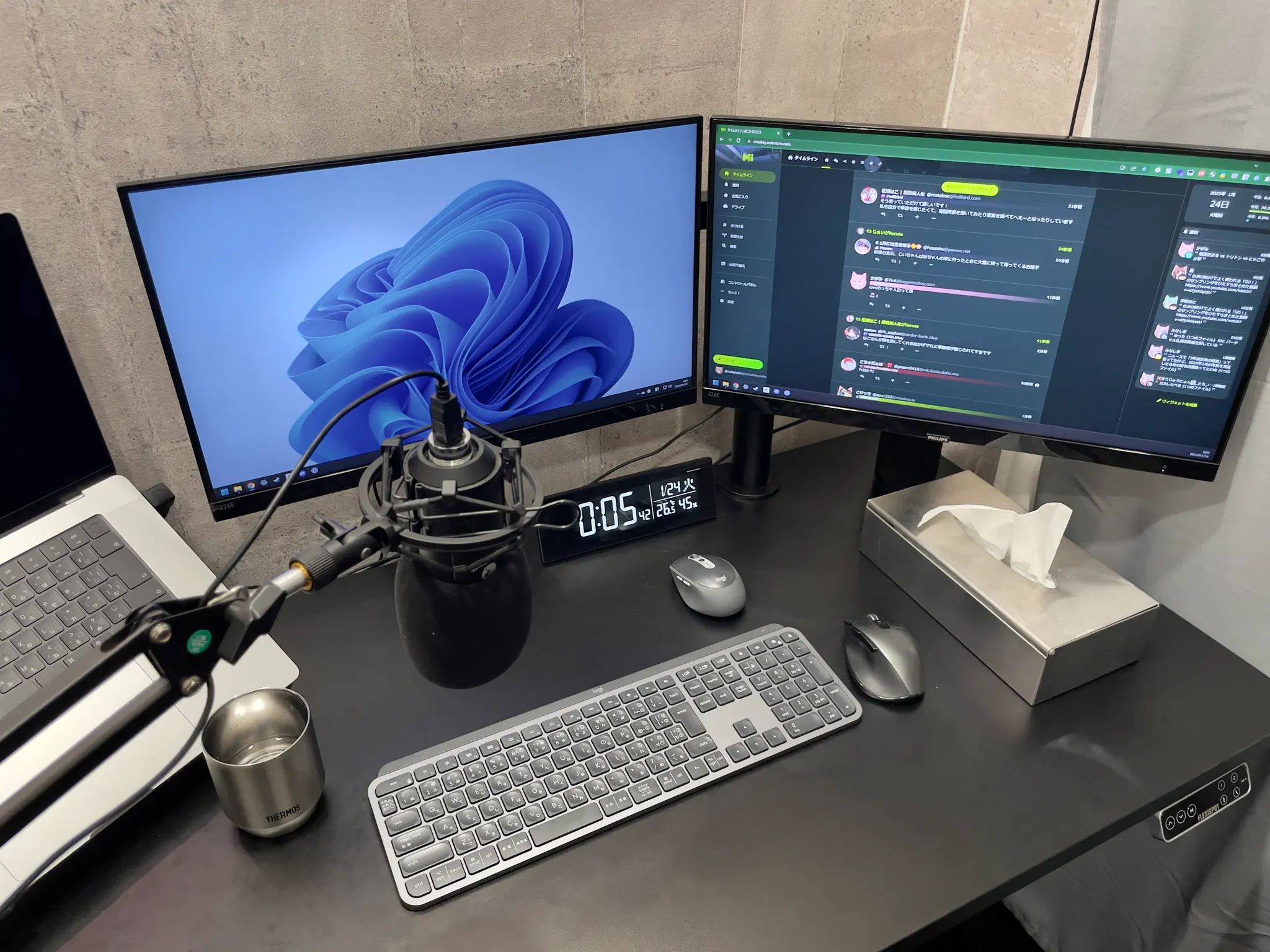この年のブラックフライデーセールで昇降式デスクを導入して、モニターも2枚とも4Kに変えて、モニターアームもマイクアームも変えたのがこれ