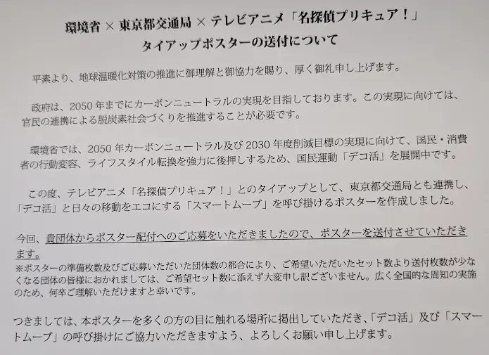 このポスターには「デコ活」「スマートムーブ」への啓蒙が目的であるという大義名分がある為か、ポスターが掲示された状態の写真提出を求められています。まぁ、活用事例のエビデンスですよね。