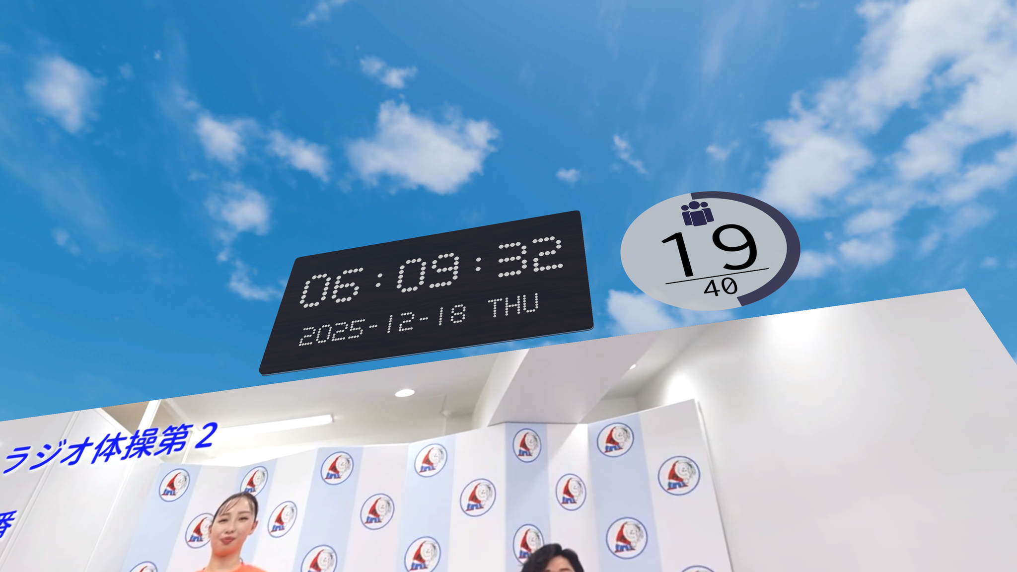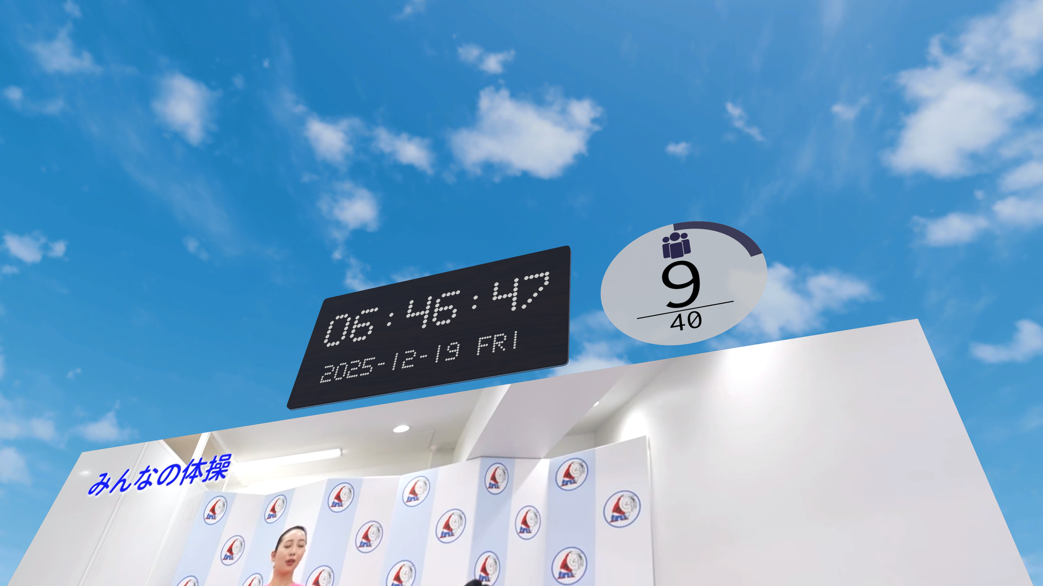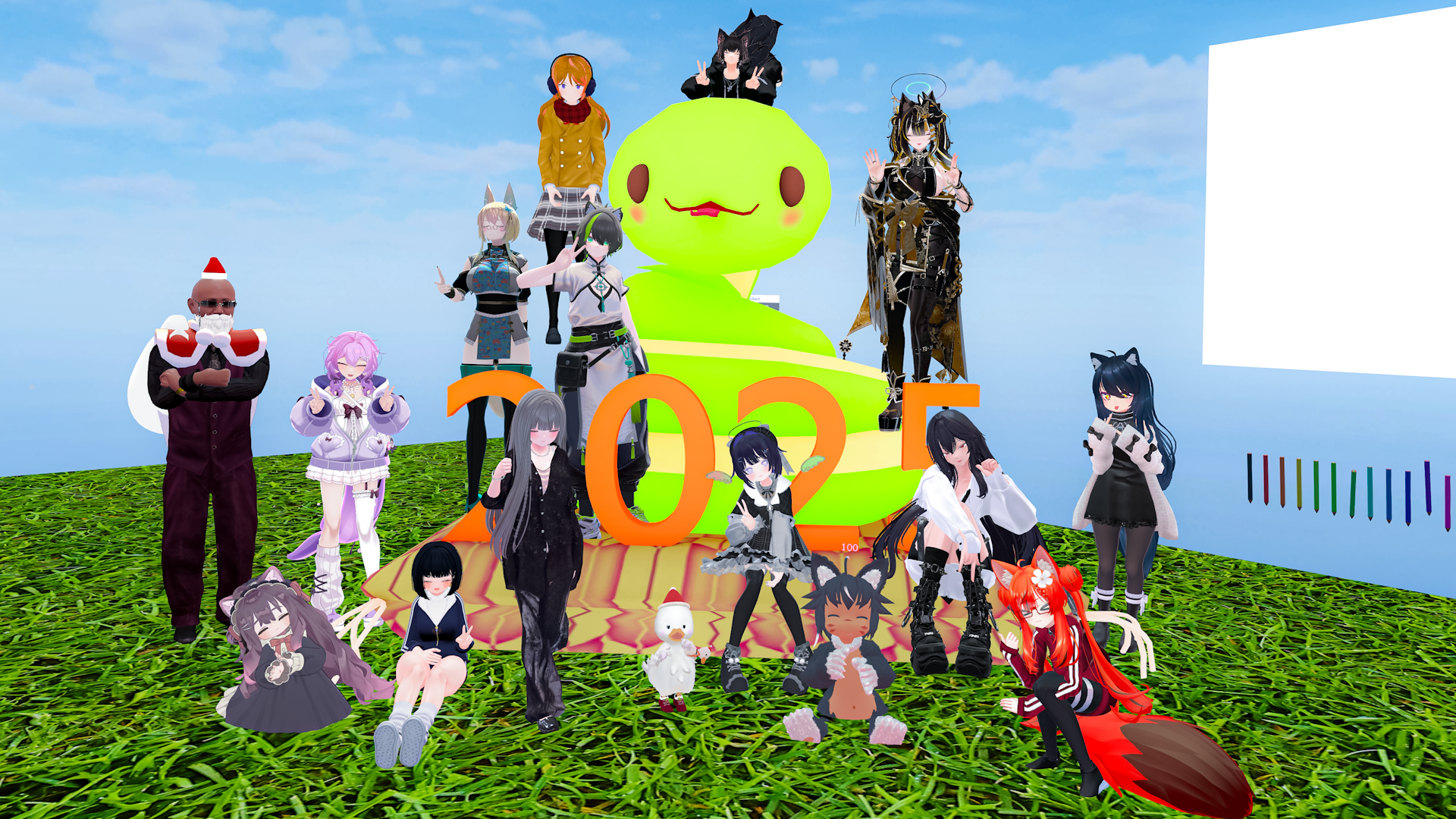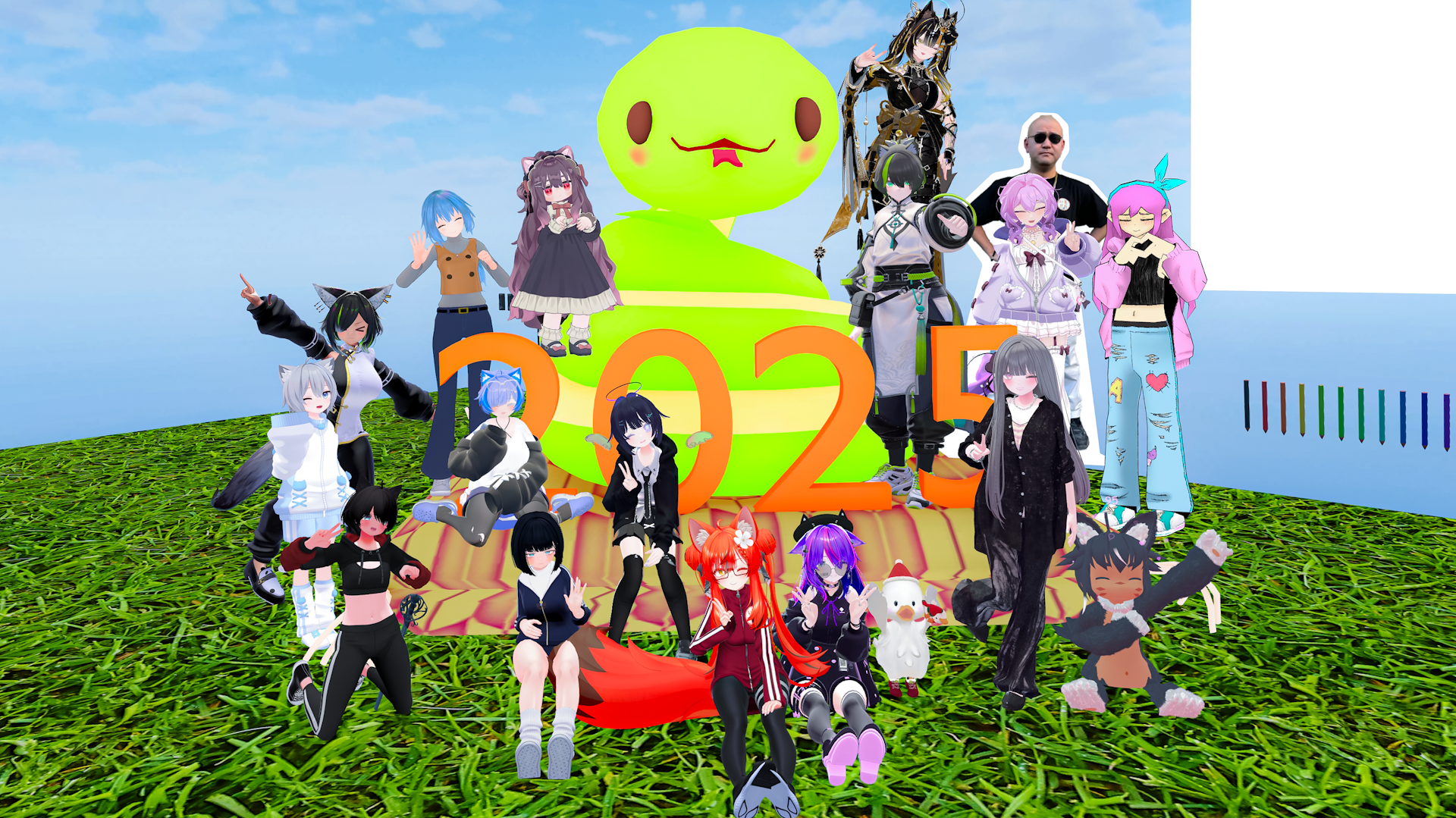 今日の #VRCラジオ体操 集合写真!昨日の #バーチャルピューロ のオープニングセレモニーと #Vket2025Winter ワールド巡りが楽しくて、トラッカー充電し忘れたまま寝ちゃってたw