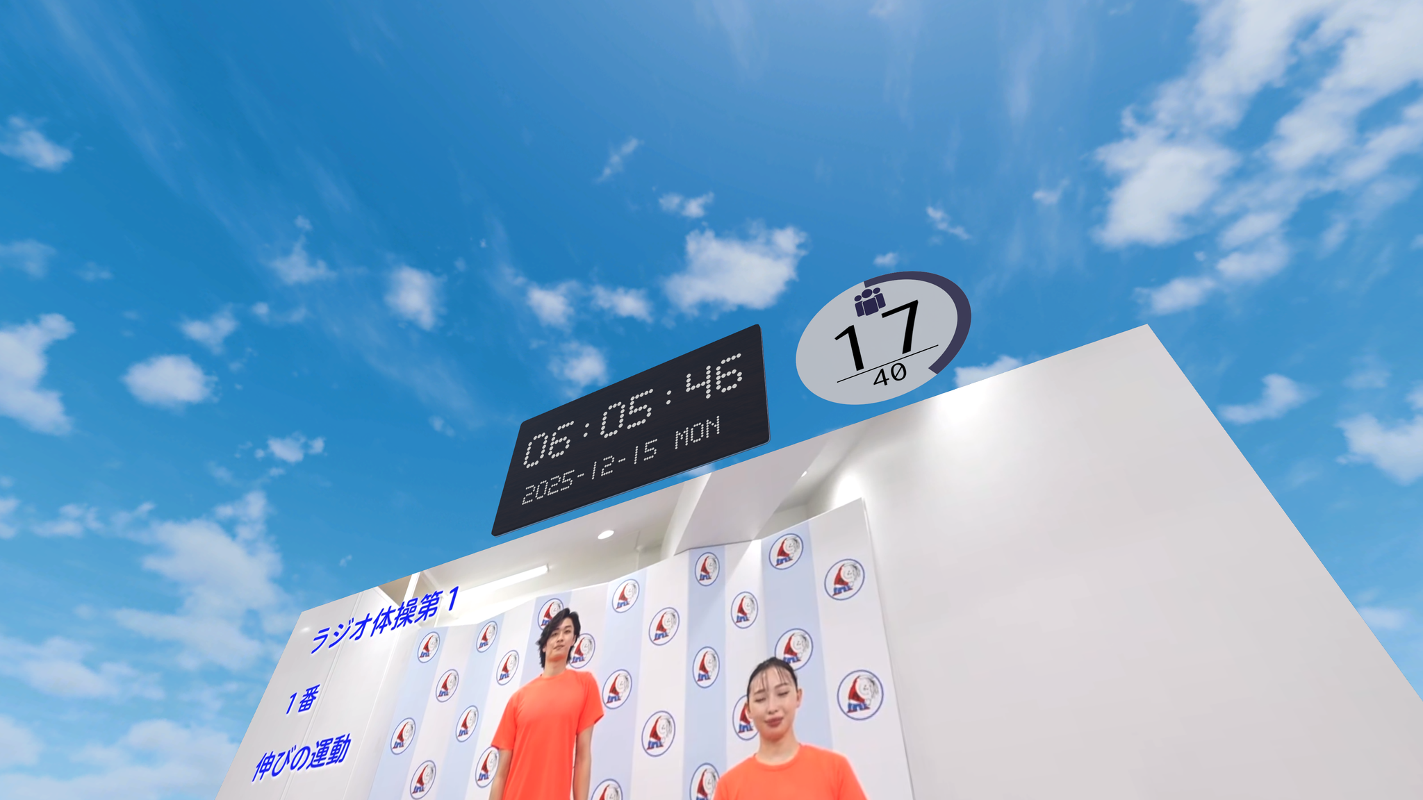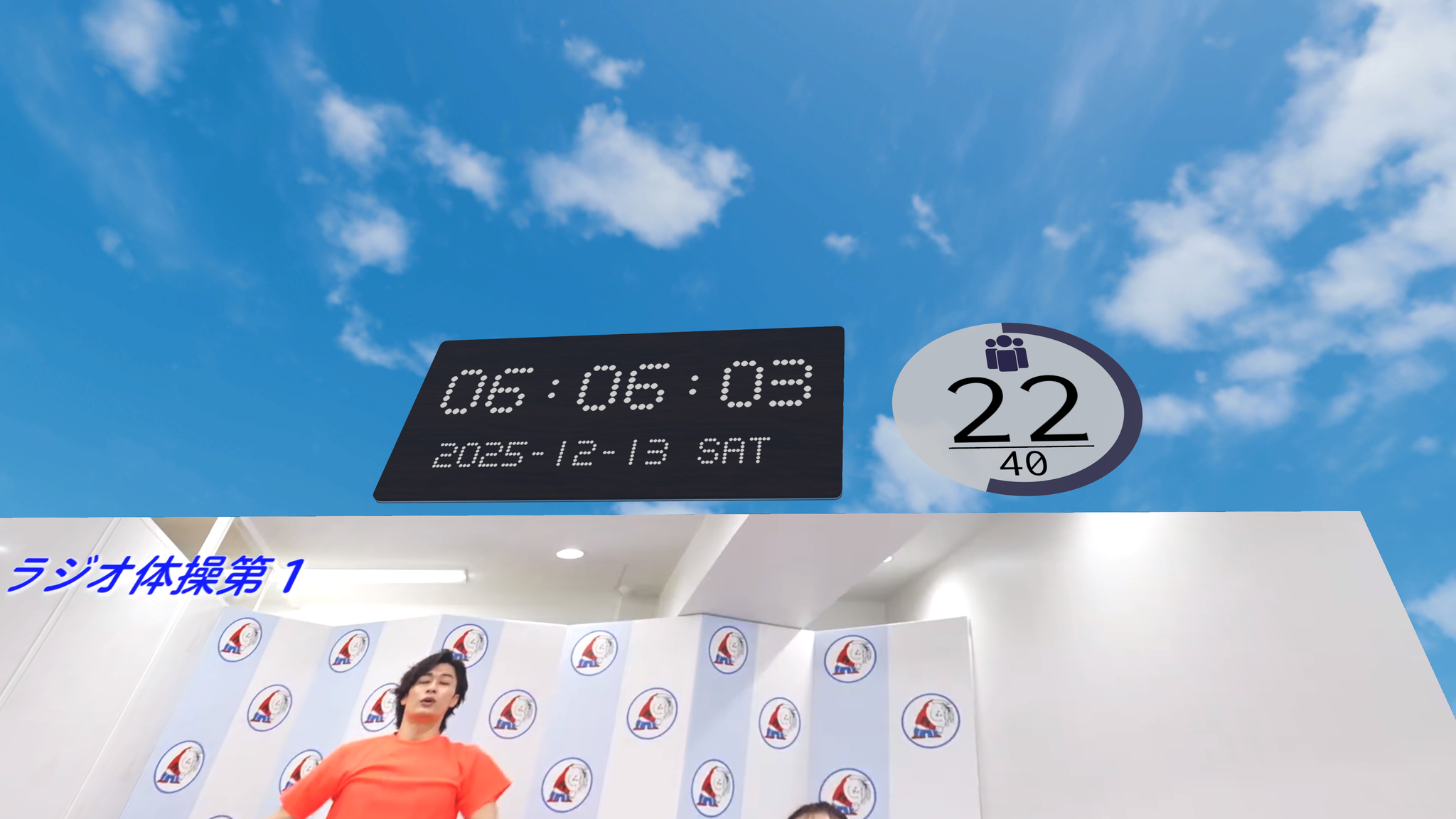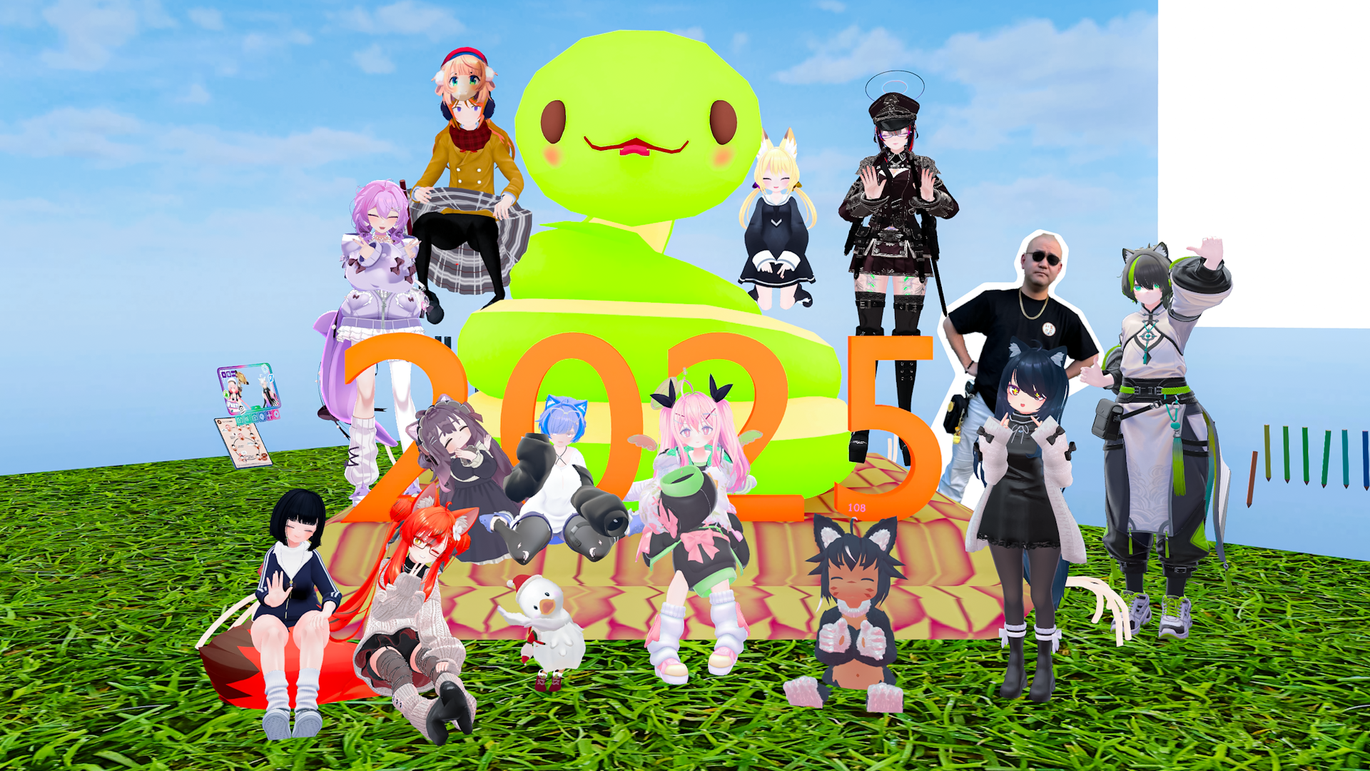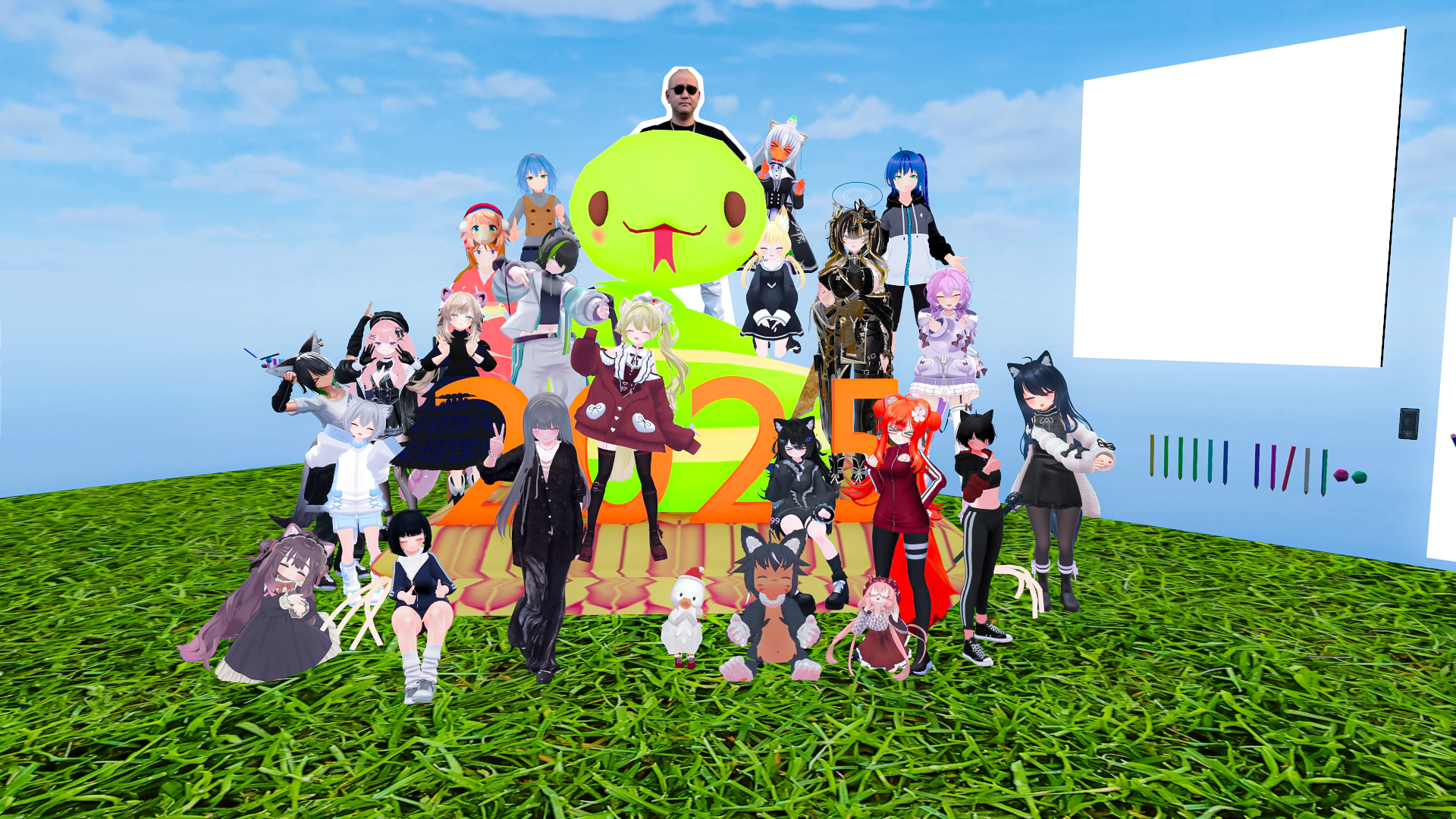 今日の #VRCラジオ体操 集合写真!昨日の #バーチャルピューロ のオープニングセレモニーと #Vket2025Winter ワールド巡りが楽しくて、トラッカー充電し忘れたまま寝ちゃってたw