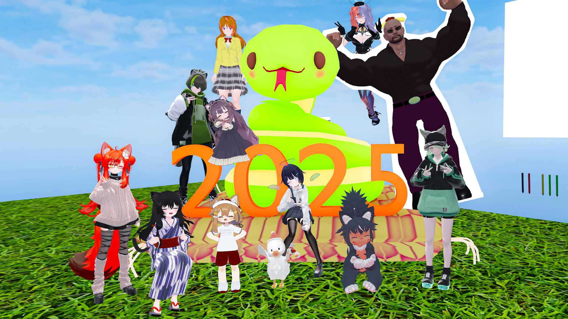 今日の #VRCラジオ体操 集合写真!主催のKleavaさんが誕生日ということでお祝いムードだった!わーい🍾 #VRChat