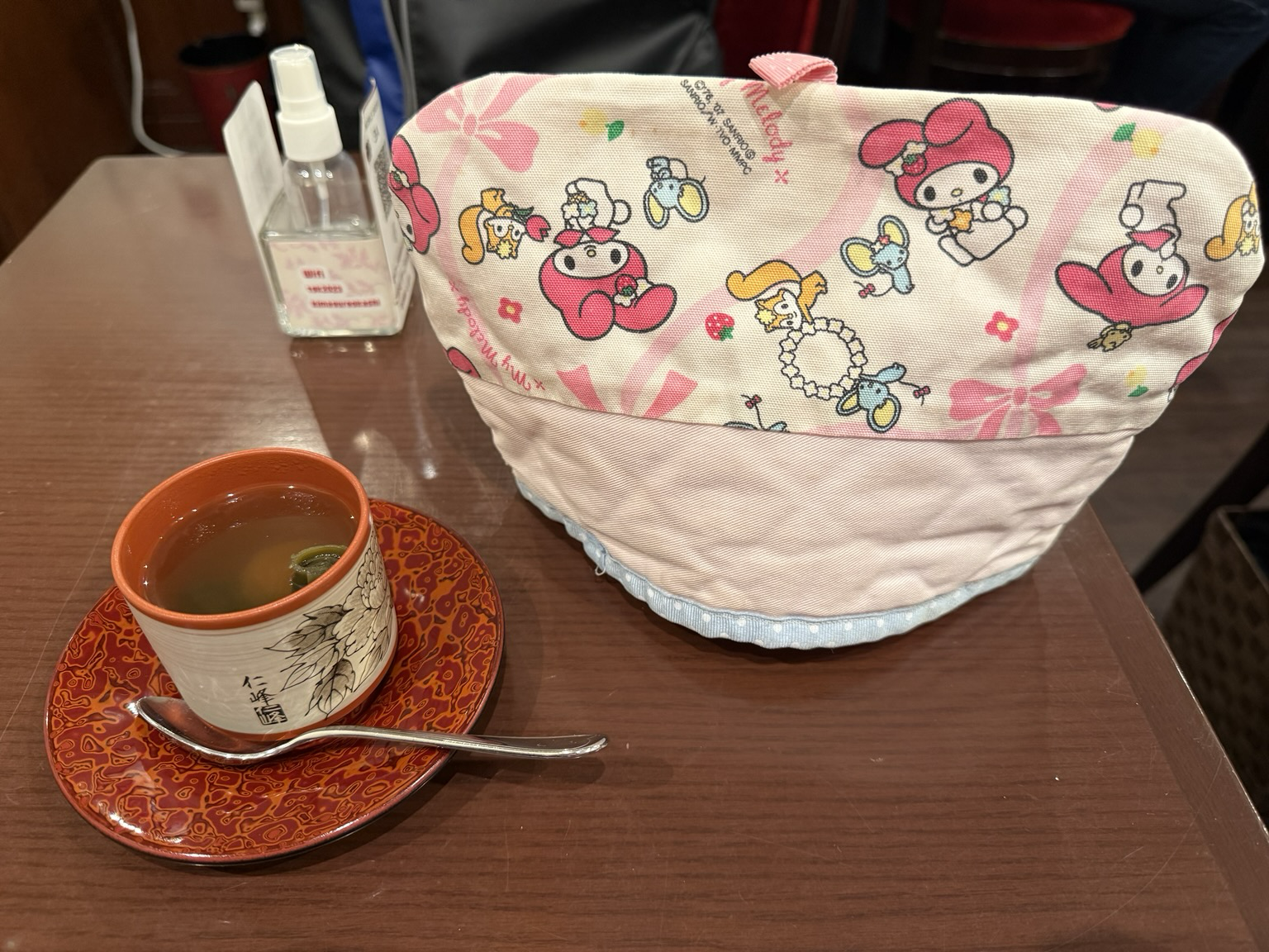 ティーコゼーの柄がマイメロだ。ポイント高い。