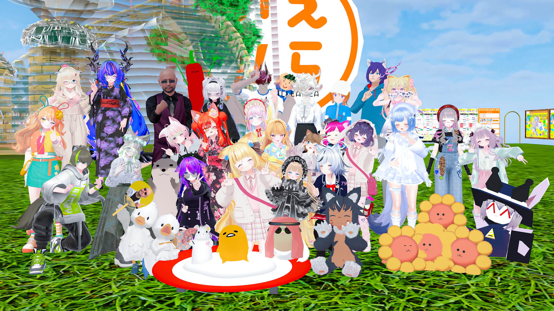 今日の #VRCラジオ体操 × #サンリオVfes 集合写真!最終日にぐでたまが来てくれた!しかもにゃんたじあのたるちゃんもいっしょ!わーい!激アツ! #VRChat