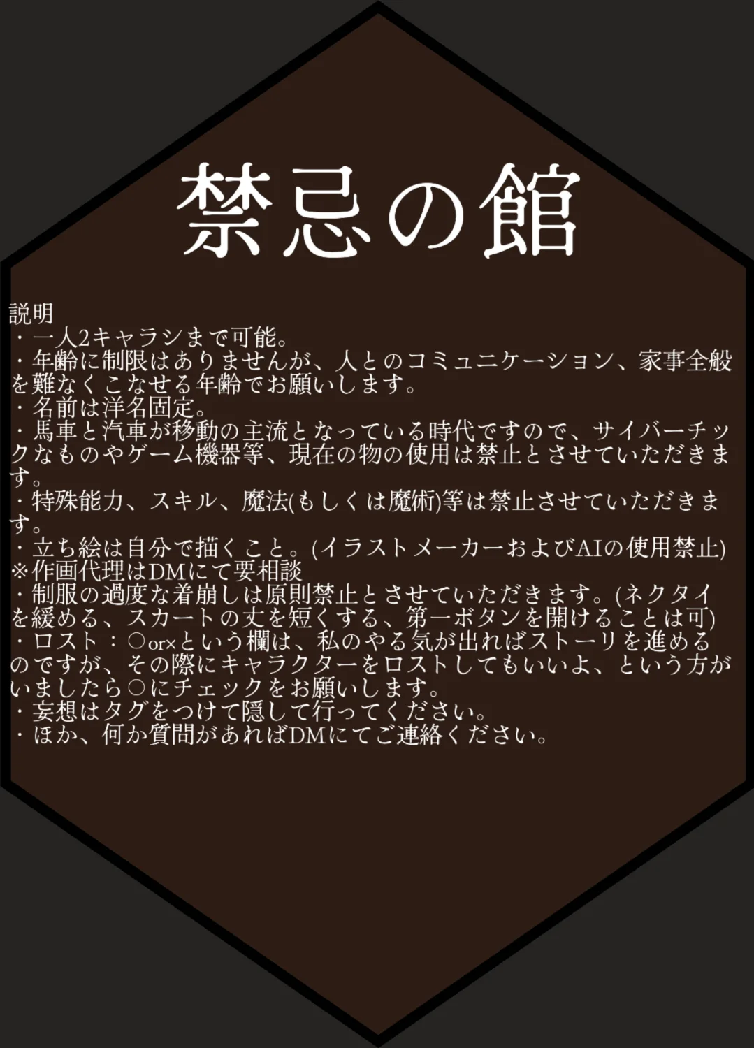 キャラ練りタグもございますので、キャラ練り段階から禁忌の館を楽しんでいただけたらな、と思っています。