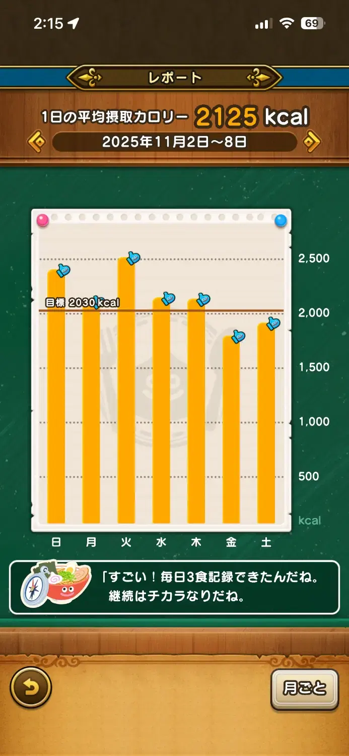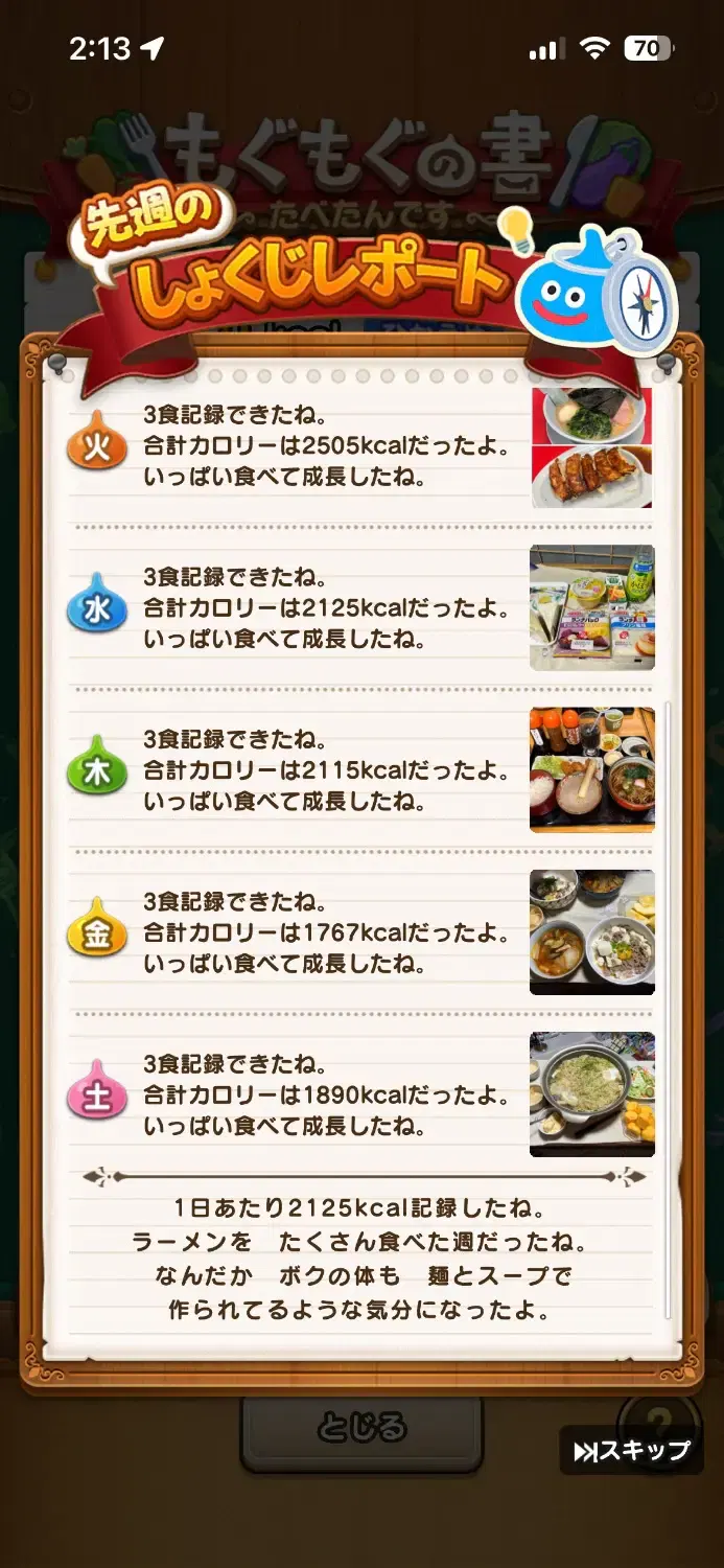 うちのもぐもぐスラミチは普通に戻りました先週は全体的にちょうどいいカロリーをとっていたみたいです。やはりその日のうちに入力することが肝要なんですかね?1日だけ入力をわすれて2回だけの日がありましたが、マイレージは2500もらえました。入力自体はその日以外は3度、日が変わる前に入れています(テキストが多い。最低1回は写真載せてるけど)#delmulin #ドラクエ #ダイの大冒険 #ウォーク #DQウォーク #dqw #dqウォーク #ドラクエウォーク
