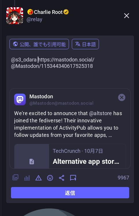 @s3_odara Twitterみたいに投稿のリンクを貼ると引用にしてくれるようだ