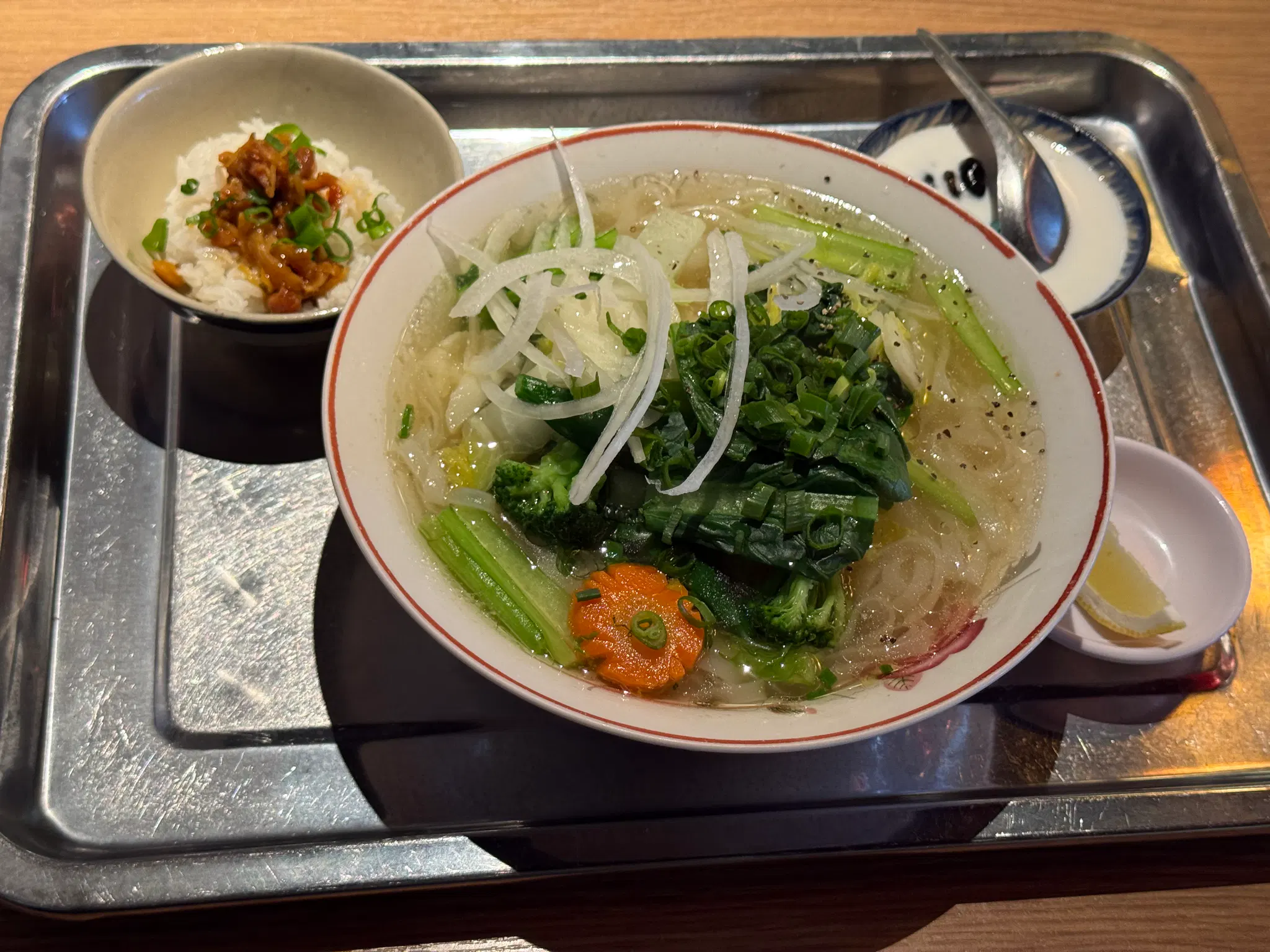 I had a lunch meal at a Vietnamese restaurant.I put chili oil on the noodle soup.
