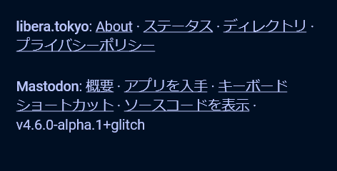 なんか知らんが、適用したMastodonのヴァージョンが v4.6.0-alpha.1+glitch になっている。