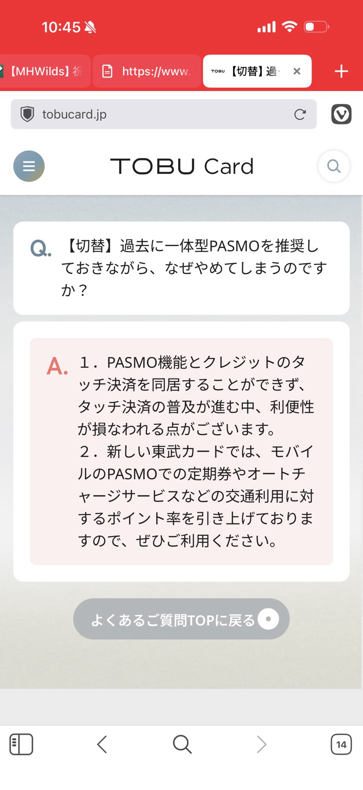 今年の6月で東武カードのPASMO一体型クレカのサービスが終わるので、忘れないうちに解約したい。