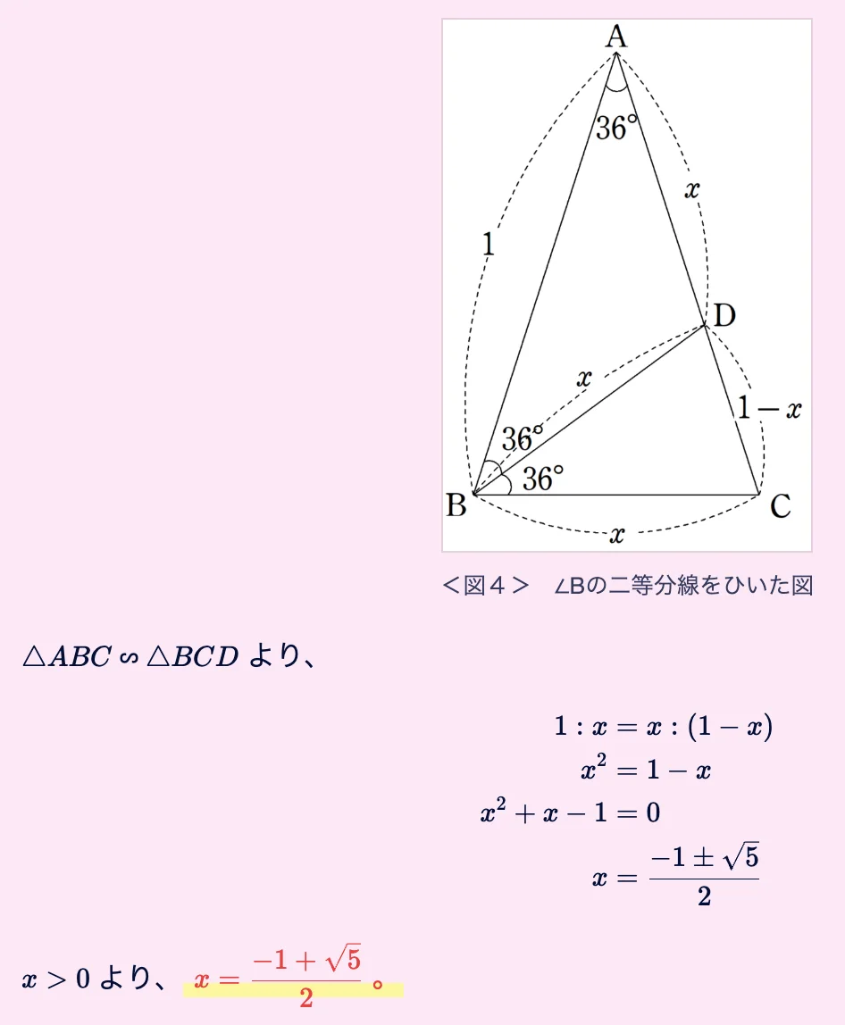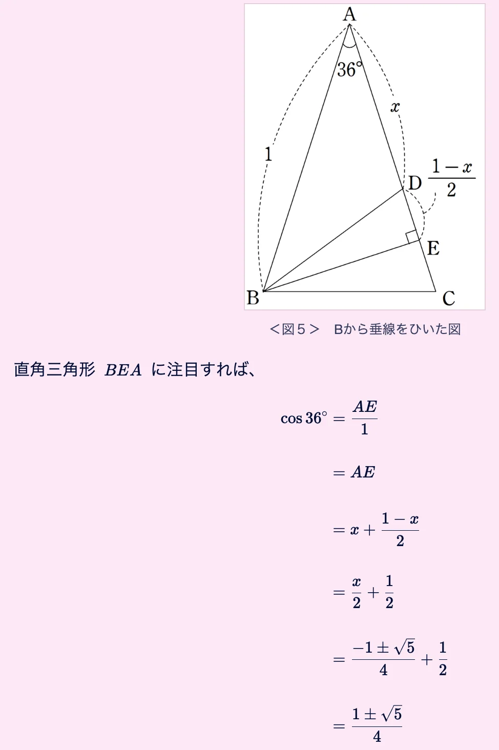 そして、sin 36°(っていうか cos 36°)の求め方、気がつけばすごくシンプル