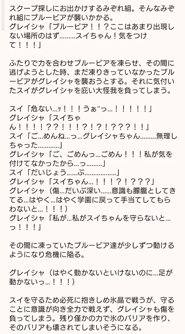 すごい危機に陥ってスイちゃんがグレイシャちゃんを無理に守ろうとして大怪我を負っちゃってどうしようってなる場面………